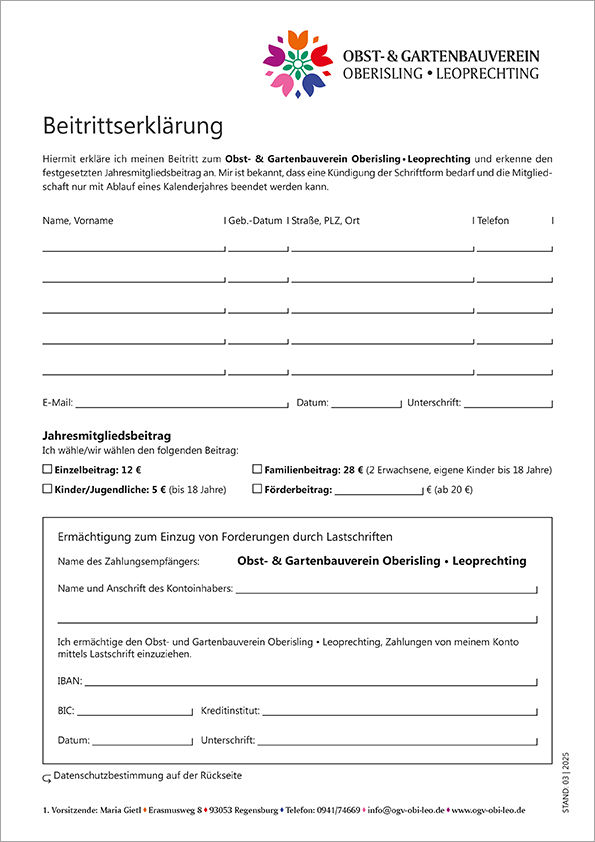 Um Mitglied zu werden, füllen Sie bitte den Mitgliedsantrag aus und schicken ihn per Post oder E-Mail an: